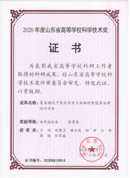 16.2020年度山东省高等公司科学技术奖一等奖-复杂模式下优化与学习共融的智能算法理论与方法