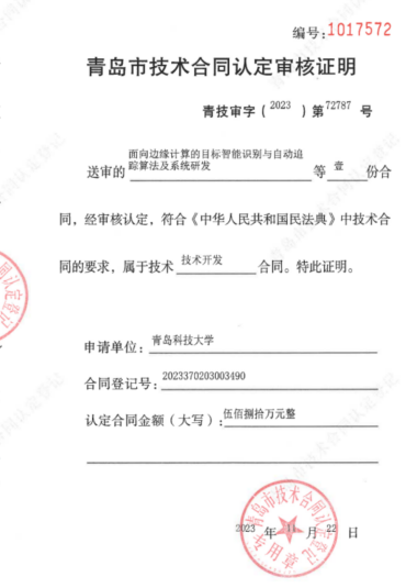 3.2023年横向课题负责人杜军威,金额580万,“面向边缘计算的目标智能识别与自动追踪算法及系统研发”