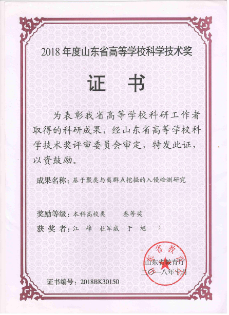 19.2018年度山东省高等公司科学技术奖三等奖-基于聚类与离群点挖掘的入侵检测研究