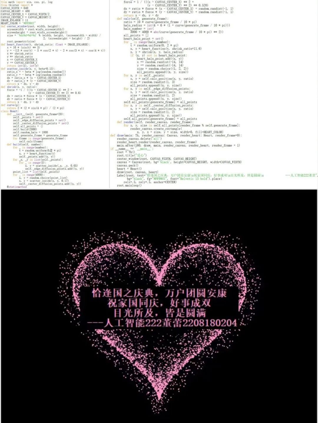 此次活动,公司广大学子积极响应,用“三行代码”谱写出独属于理工科的浪漫情诗,深情告白祖国。这彰显了同学们的专业技能与特色,同时用三行代码浪漫地诉说“生在红旗下,长在春风里”的骄傲与自豪。数科学子通过这别开生面的表白方式,向祖国献上了最真挚的祝福与热爱:愿山河无恙,祖国繁荣昌盛。