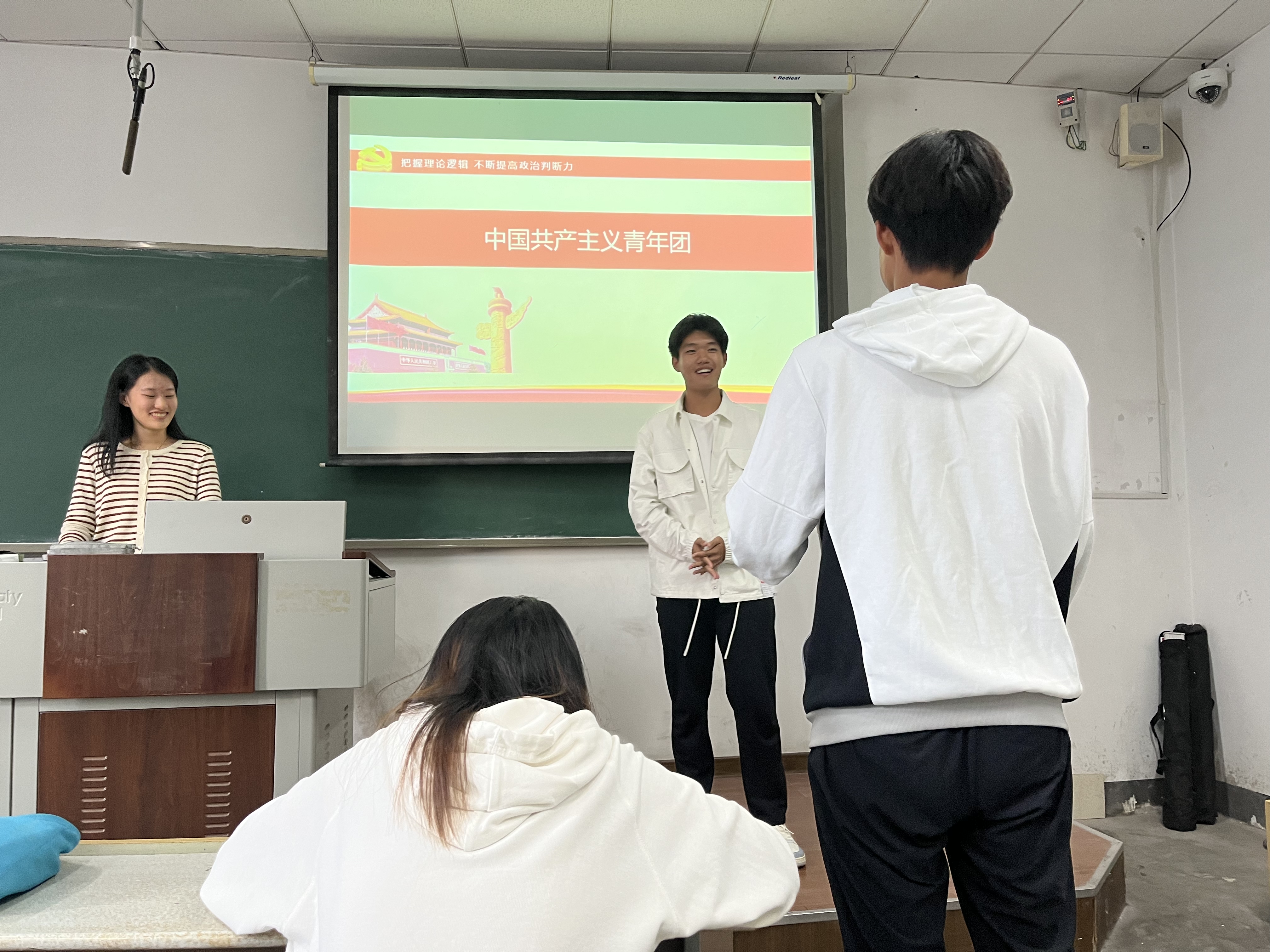 本次团课分为三个部分,房超文向同学们介绍了共青团的基础知识、共青团的历史发展阶段以及如何成为一名优秀的共青团员。第一部分,把握理论逻辑、不断提高政治判断力。首先,房超文为同学们介绍了“入团三大性”、“三会两制一课”、共青团的组织性质和基本任务、团费的用途以及共产党、共青团和少先队的关系。随后,向大家详细讲解了团员证、团徽及团旗上每一个元素的象征意义。最后,她邀请八位同学,两两一组进行“团史知识你说我猜”游戏,进一步加深了大家对团史知识的学习。第二部分,明晰历史逻辑、不断提高政治领悟力,带领同学们回顾了共青团由萌芽到成熟的四个发展历程,通过学习,同学们对共青团的成长历程有了更加清晰的认识。第三部分,坚持实践逻辑、不断提高政治执行力。房超文号召同学们要做一个有理想、敢担当、不保守、肯付出的优秀共青团员。“有理想”要求同学们把理想和现实有机结合,“敢担当”就要勇于挑起自身的责任,“不保守”是要跟紧时代的步伐,不断进步,勇于创新,“肯付出”就是要继承先辈们的奉献精神,并将其发扬光大。
