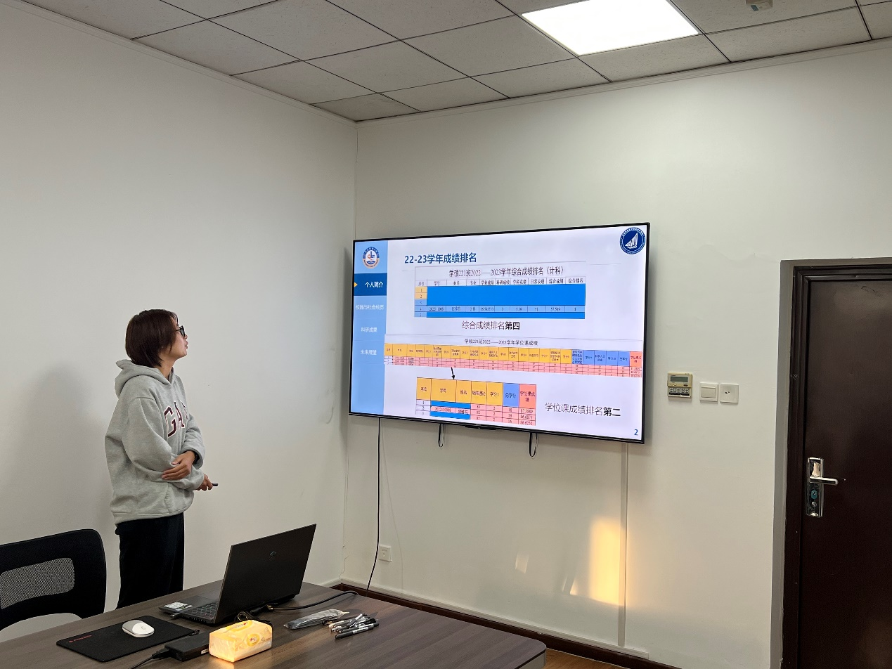在答辩环节,三位同学依次上台,以PPT的形式,从学术、科研和社会实践等方面展示自己在研究生生活中的成长与收获,讲述了在科研项目中的成长、在实践活动中的体会,以及对未来的规划和展望。