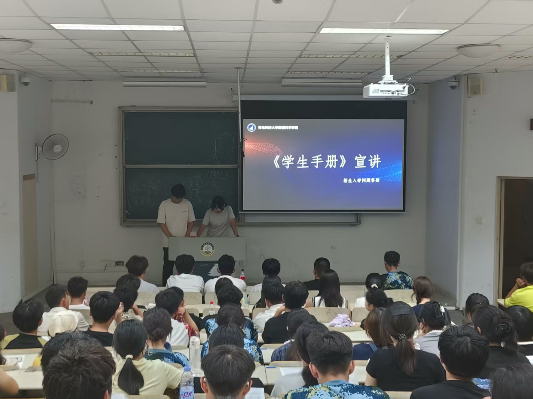 宋天宇围绕党团建设、奖惩情况、违纪处分三大核心板块展开讲解,梳理入团入党全流程及入党积极分子认定标准,说明综合测评构成与品行表现分细则、学业预警情形,介绍警告至开除学籍五类处分等级,明确爬墙、夜不归宿等禁止行为,并重申考试作弊的严肃处分规定。王豪聚焦宿舍建设内容,详细介绍入住制度、安全规范、水电供应时间、空调使用保修方式,以及 “青科学工” 平台请假销假流程。