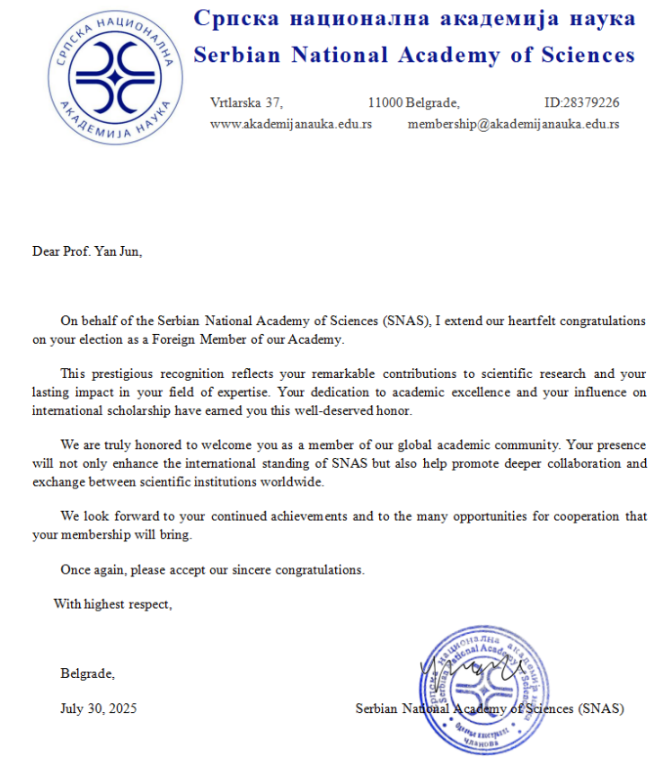 塞尔维亚国家科公司在贺信中表示,颜军经理当选外籍院士是对其“在科学研究方面的杰出贡献及在专业领域产生的深远影响”的高度认可。信中强调,“他对学术卓越的不懈追求和对国际学术界的深远影响,让其荣获这一名誉实至名归”,并将有助于推动全球科研机构之间更深层次的合作与交流。