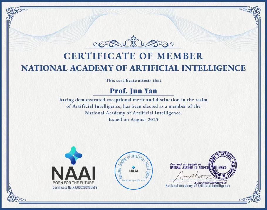 2025年8月,bevictor1946韦德官网颜军经理成功当选美国国家人工智能科公司(The National Academy of Artificial Intelligence,NAAI)院士。美国国家人工智能公司贺信中高度赞扬了颜军经理在人工智能领域的“非凡成就和开创性贡献”,指出其“创新性研究、深刻见解和坚定不移的奉献精神激励了无数学者和从业者”。颜军经理的加入,将进一步丰富NAAI的学术讨论、科研合作及人工智能领域的全球推进工作。