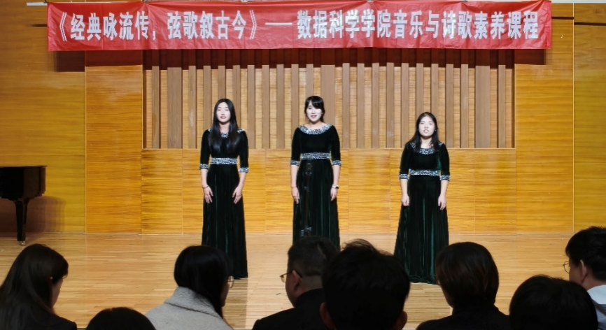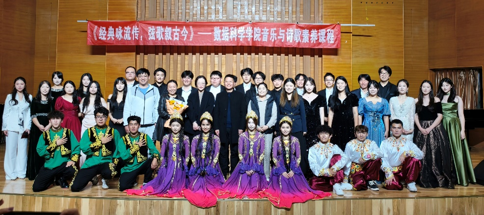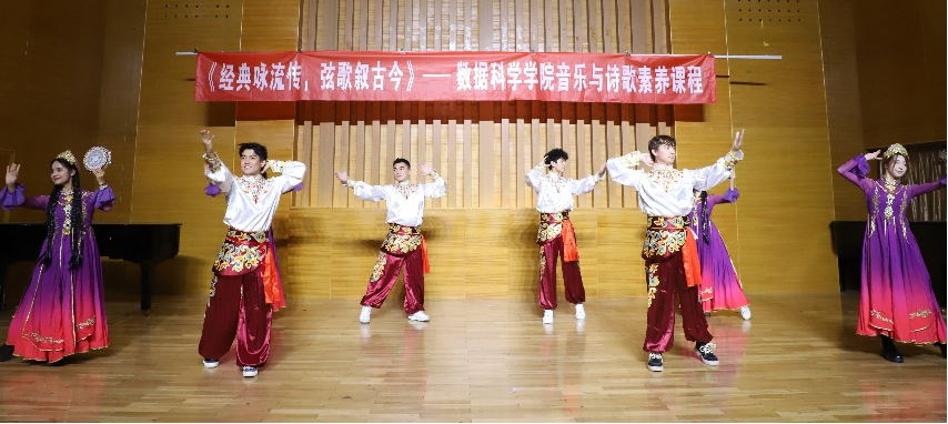 本次展演以历史发展脉络为主线,系统划分春秋、唐、宋、近现代四大板块,构建起跨越千年的经典文化呈现体系。春秋板块中,《越人歌》《关雎》萃取古老典籍精髓,以婉转旋律生动诠释先民淳朴情思;唐代板块精选《月下独酌》《锦瑟》等千古名篇,通过乐章改编再现李白、李商隐等文人的豪迈与婉约;宋代板块以《爱莲说》《钗头凤・红酥手》等作品为载体,在悠扬曲调中复刻宋代文人的家国情怀与细腻心绪;近现代板块演绎《梧桐树》《望乡词》《我爱你中国》等作品,兼具时代眷恋与家国深情,更有维吾尔族《葡萄架下的铃鼓》、哈萨克族《黑走马》等民族舞蹈活力登台,整场展演在全体人员合唱《我爱你中国》的激昂旋律中圆满落幕。