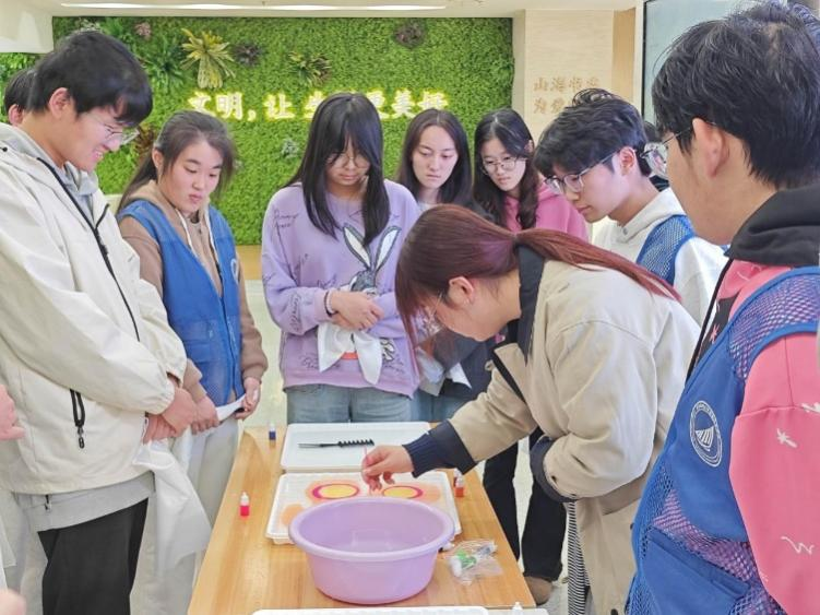活动伊始,李贞导师围绕水拓技艺的历史脉络与文化内核展开系统讲解。这门古称“墨池法”的古老技艺,溯源至唐代,是我国古代劳动人民智慧的凝练,承载着千年丝路文化的审美意蕴与工艺传承。李贞导师不仅详解其精湛技法,更阐释其中“天人合一”的东方哲学,为志愿者搭建起深度感知非遗魅力、践行文化传承的优质平台。