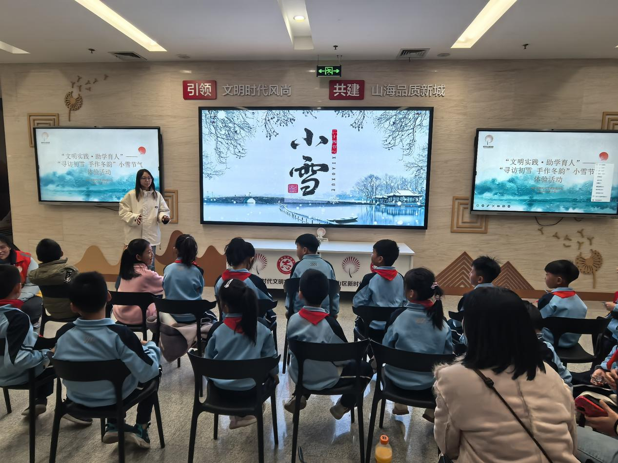 为推动中华优秀传统文化走进青少年生活,充分发挥志愿服务在文化传承中的桥梁作用。11月19日下午,“小星云”志愿服务团队走进崂山区新时代文明实践中心承办的"文明实践,助学育人"系列活动之"寻访初雪,手作冬韵"小雪节气体验活动,为育才小学 20 余名员工带来沉浸式民俗文化盛宴,以青春力量赋能传统习俗创新传播。