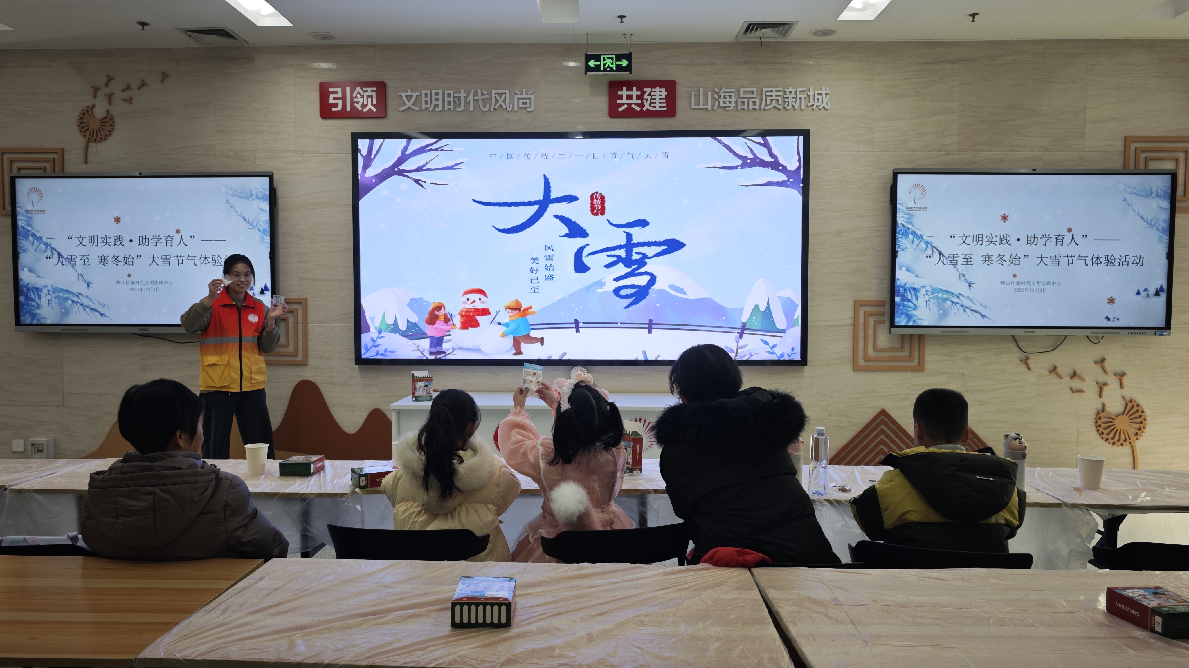 活动期间,志愿者团队依托精心制作的PPT课件,以通俗易懂、生动活泼的语言,向孩子们系统普及大雪节气相关知识。从节气名称的历史渊源和气候特征的科学原理,再到“瑞雪兆丰年”等经典谚语及诗词典故,志愿者们将抽象的传统文化知识转化为具象化表达,引导孩子们沉浸式感受冬日节气的独特韵味,现场学习氛围浓厚,互动反响热烈。