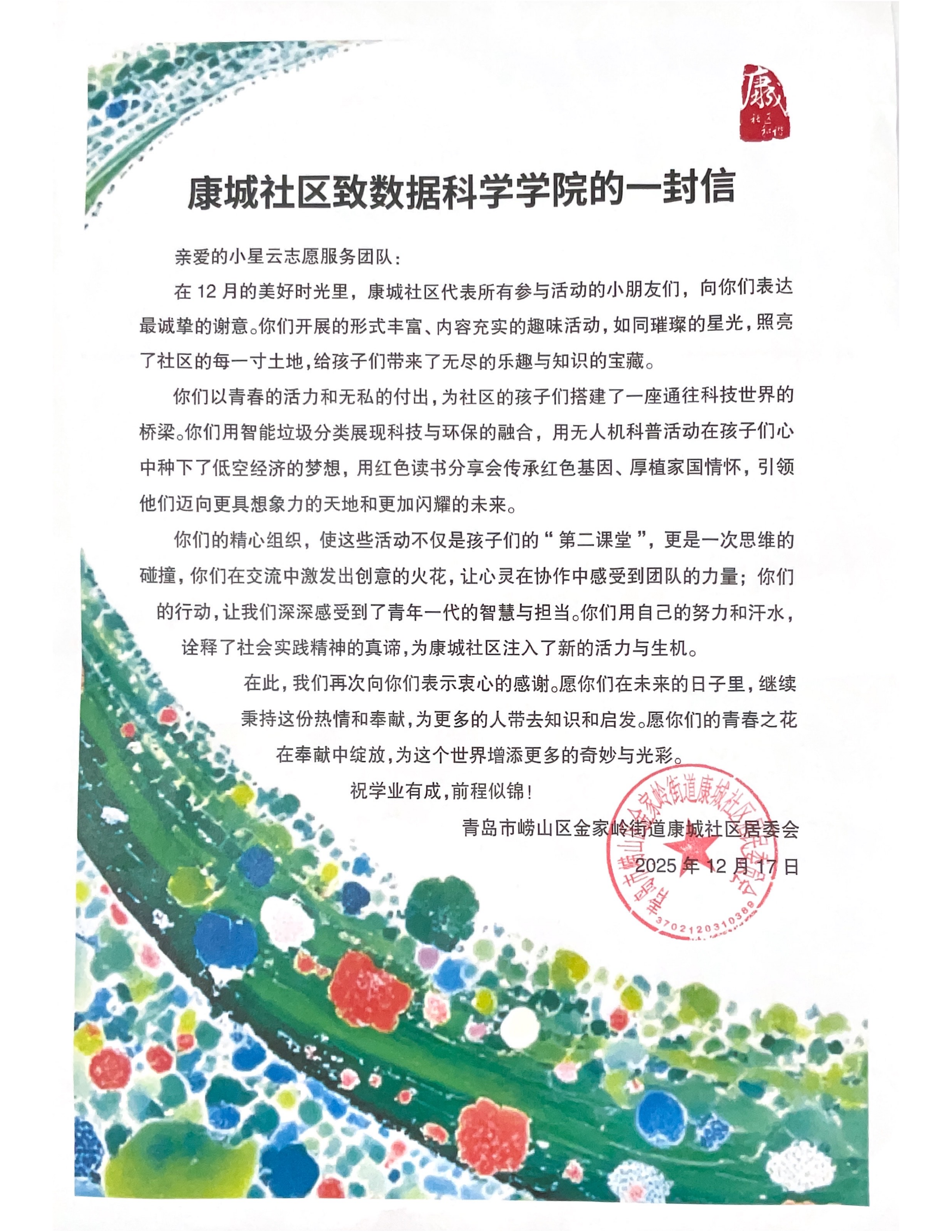 为传承红色基因、厚植青少年家国情怀,响应科技强国战略号召,充分发挥高校服务社会职能,12月,bevictor1946韦德官网“小星云”志愿服务团队走进青岛市崂山区金家岭街道康城社区,开展系列主题志愿服务活动。“小星云”志愿服务团队以青春担当传递知识温度与成长力量,系列活动获得康城社区居委会、员工家长及青少年群体的高度认可与广泛好评。社区居委会专门致信表达诚挚谢意,充分肯定了志愿服务的专业价值与深远意义。