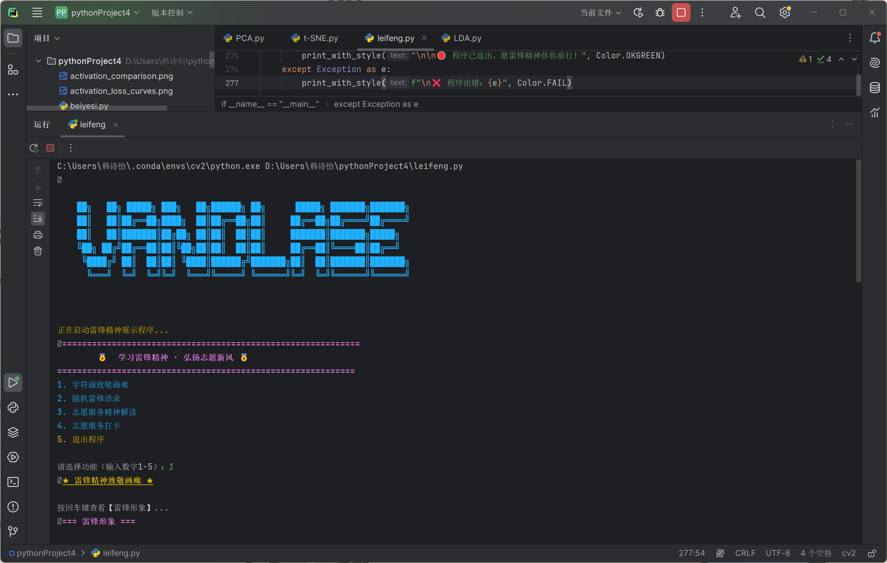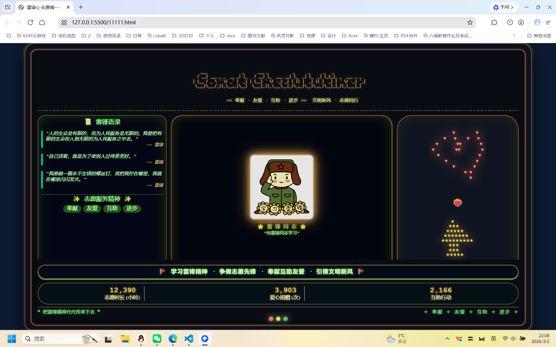 活动以来,数科学子积极响应公司号召,立足专业特色,将编程技能与雷锋精神深度融合,涌现出一批兼具思想性、创意性与专业性的优秀作品。学子们充分发挥专业优势,或通过代码精准呈现雷锋经典语录,传递精神力量;或用字符画精心勾勒雷锋形象、五角星等致敬元素,定格精神瞬间;或依托终端、网页交互效果,生动展现志愿服务的内涵与价值。这些作品以科技赋能精神传承,让雷锋精神在数字时代焕发新的生机,充分展现了数科学子扎实的专业素养、创新的思维能力和浓厚的志愿情怀。