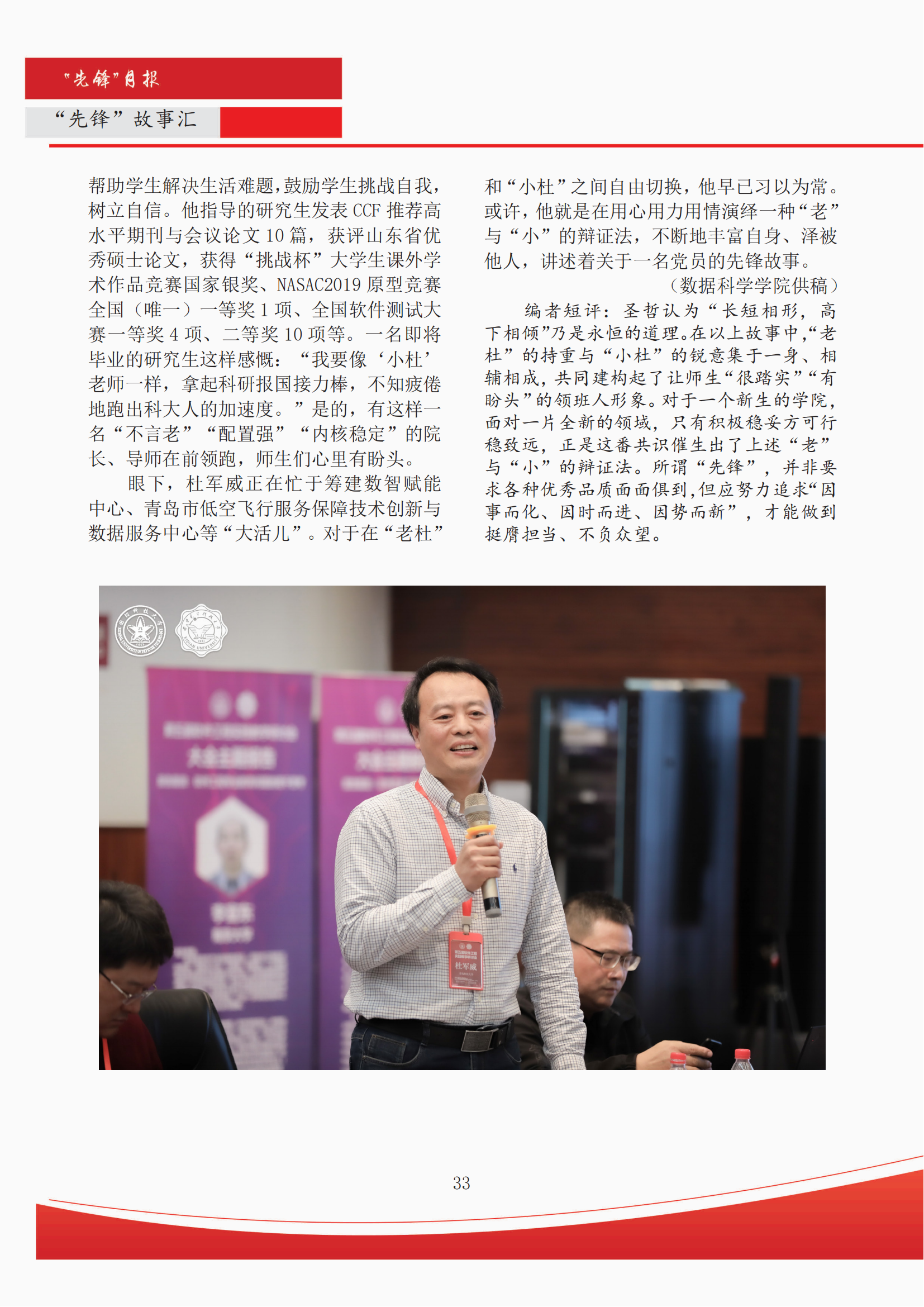 日前,公司《“先锋”月报》第三期刊发了公司杜军威教授的事迹,引起了校内师生的广泛关注。全文如下: