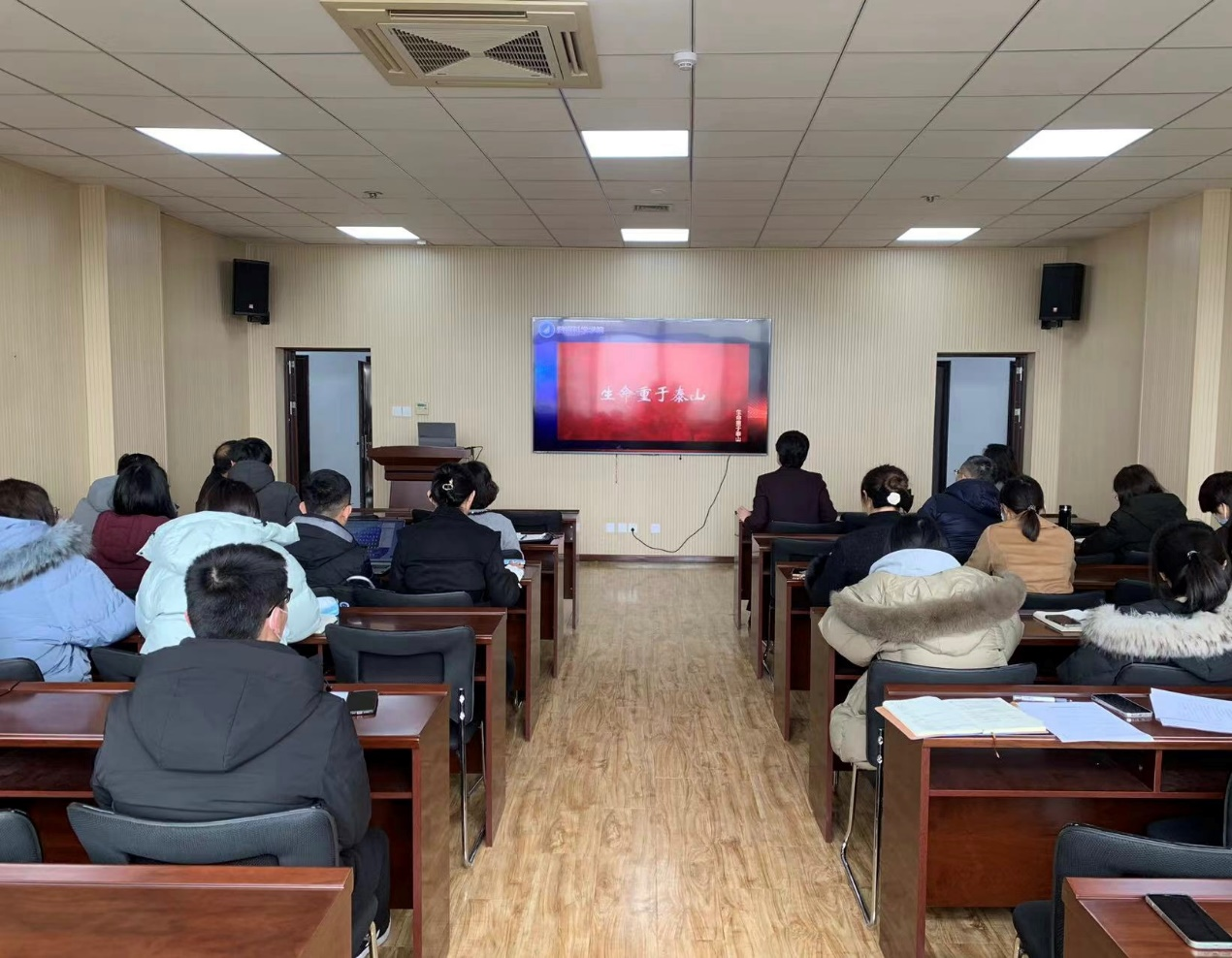 会上组织全体教职工观看了《生命重于泰山》和应急逃生的相关视频。