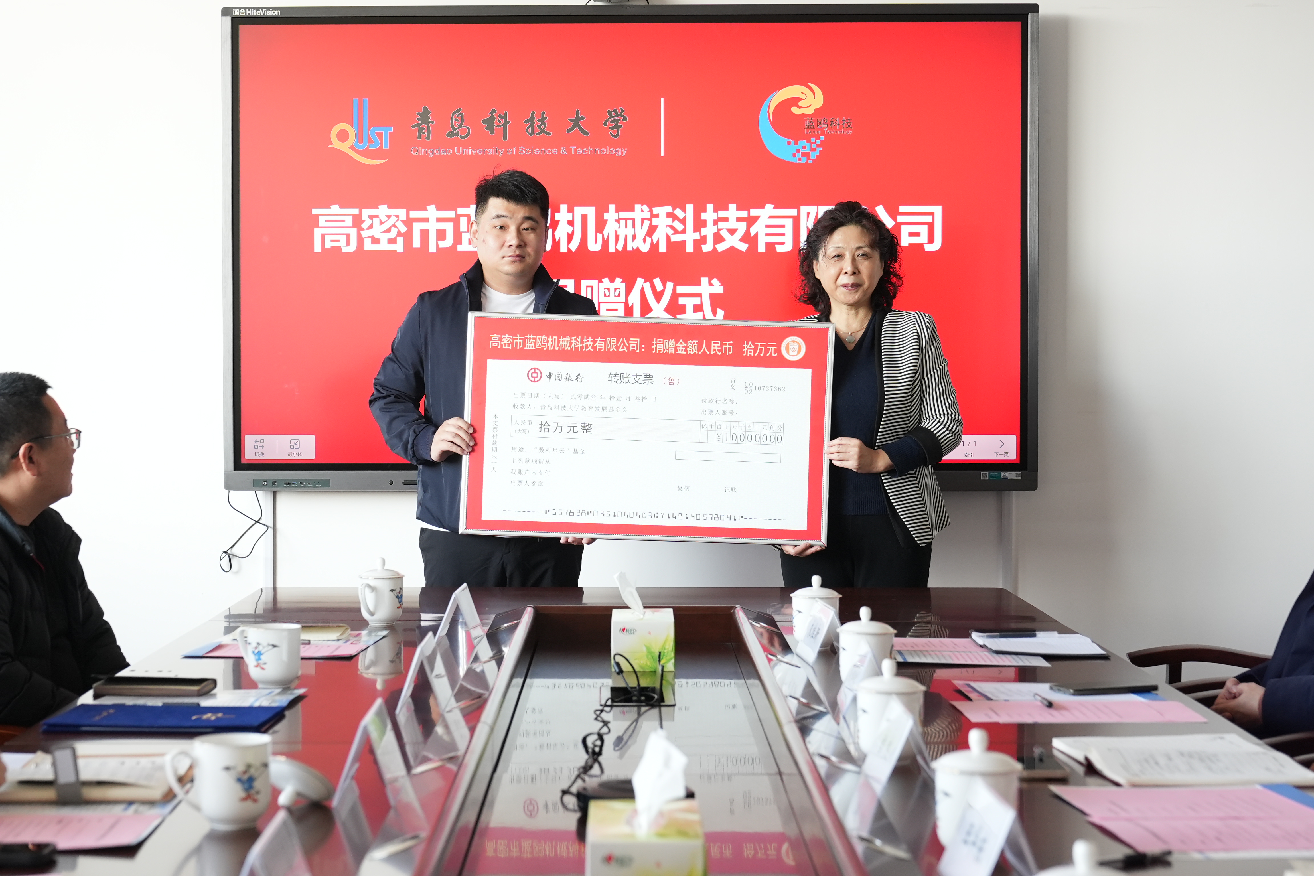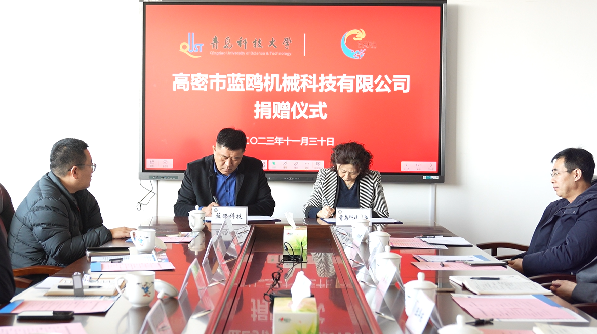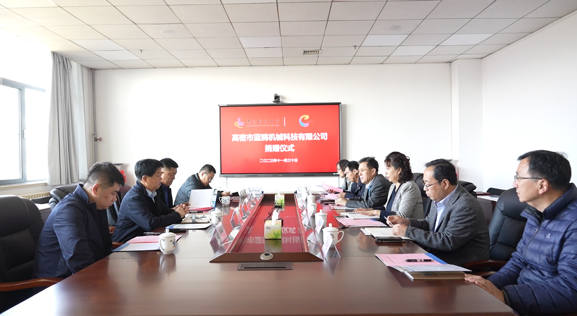 11月30日上午,高密市蓝鸥机械科技有限公司捐赠仪式在图书馆A区5004会议室举行。高密市蓝鸥机械科技有限公司董事长于洪亮、总经理李彪、特别助理于海洋、技术总监于泳水,公司数据科学公司党总支书记官杰、经理助理戴学仁出席仪式。
