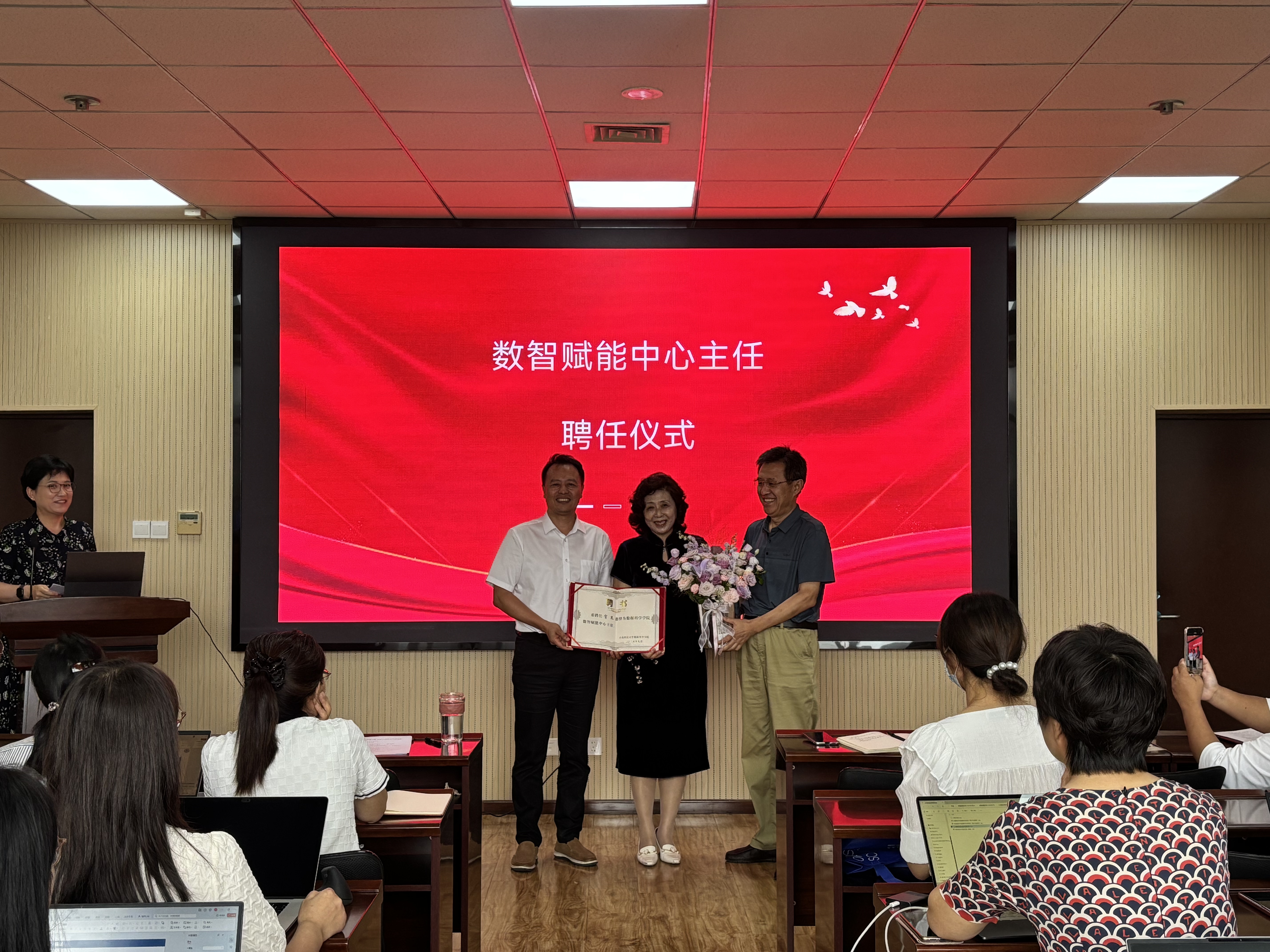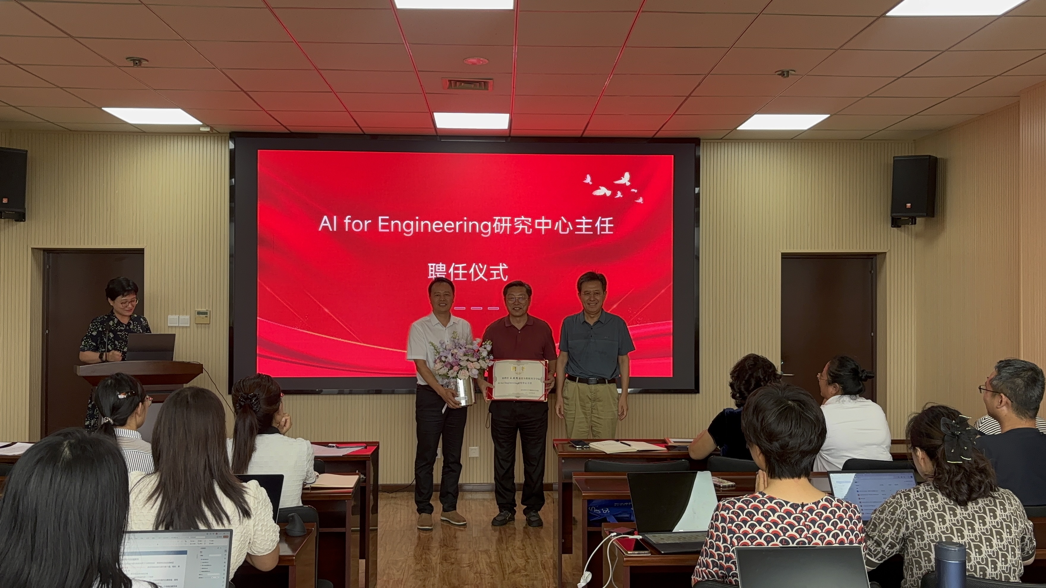 会议第二项,公司举行AI for Engineering 研究中心、数智赋能中心聘任仪式。分别聘任王殿辉教授为AI for Engineering 研究中心主任,聘任官杰教授为数智赋能中心主任。bevictor1946韦德官网常务副经理杜军威、特聘经理助理戴学仁为两位主任颁发聘书并献花。两位主任分别发表聘任感言。
