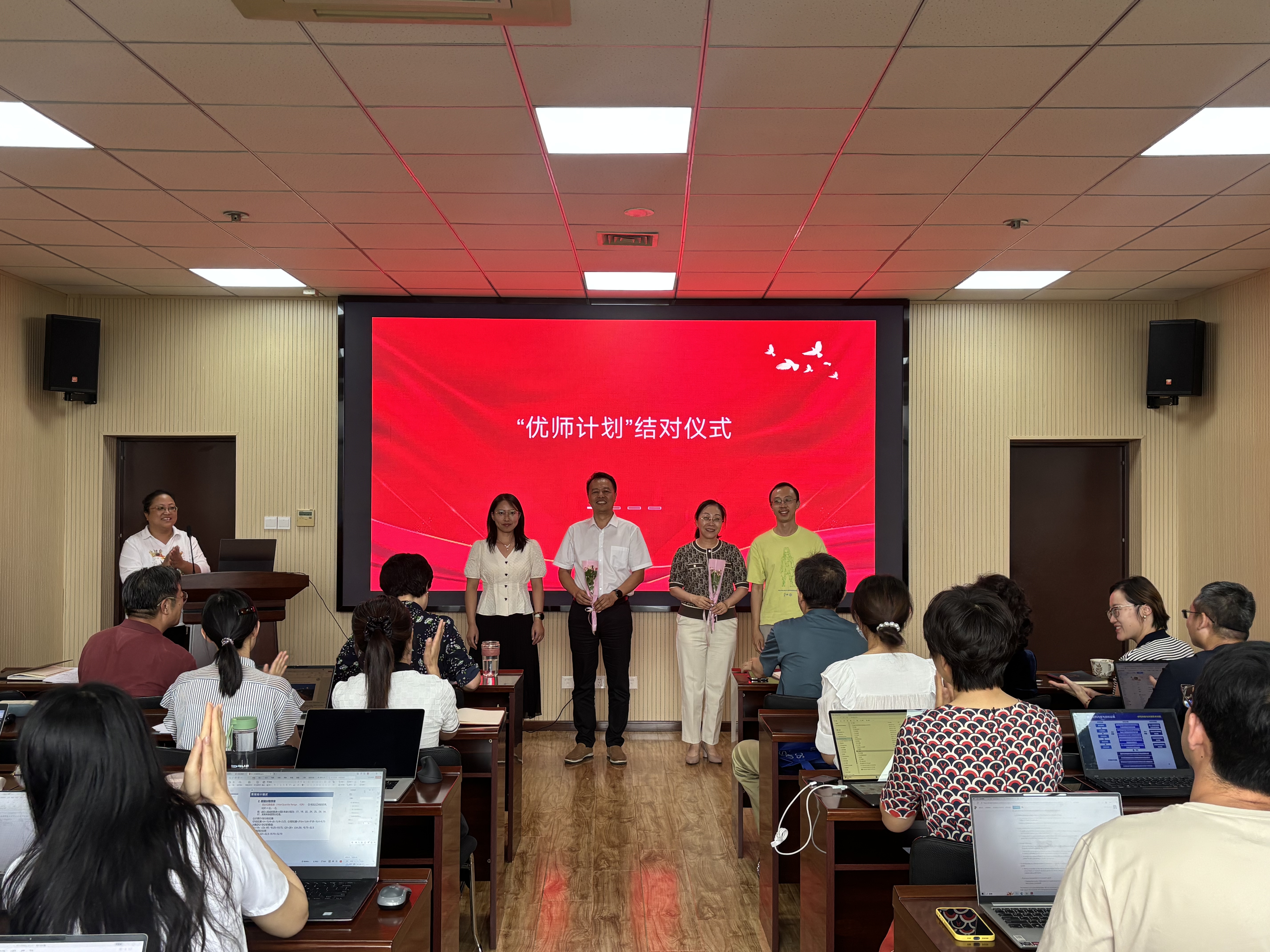 会议第三项举行“优师结对”计划,杜军威教授与孙靖教授作为指导教师,分别与新进教师陈国荣、马振宇结成帮扶对子,帮助新进教师快速适应教学科研岗位,提升专业能力与育人水平。
