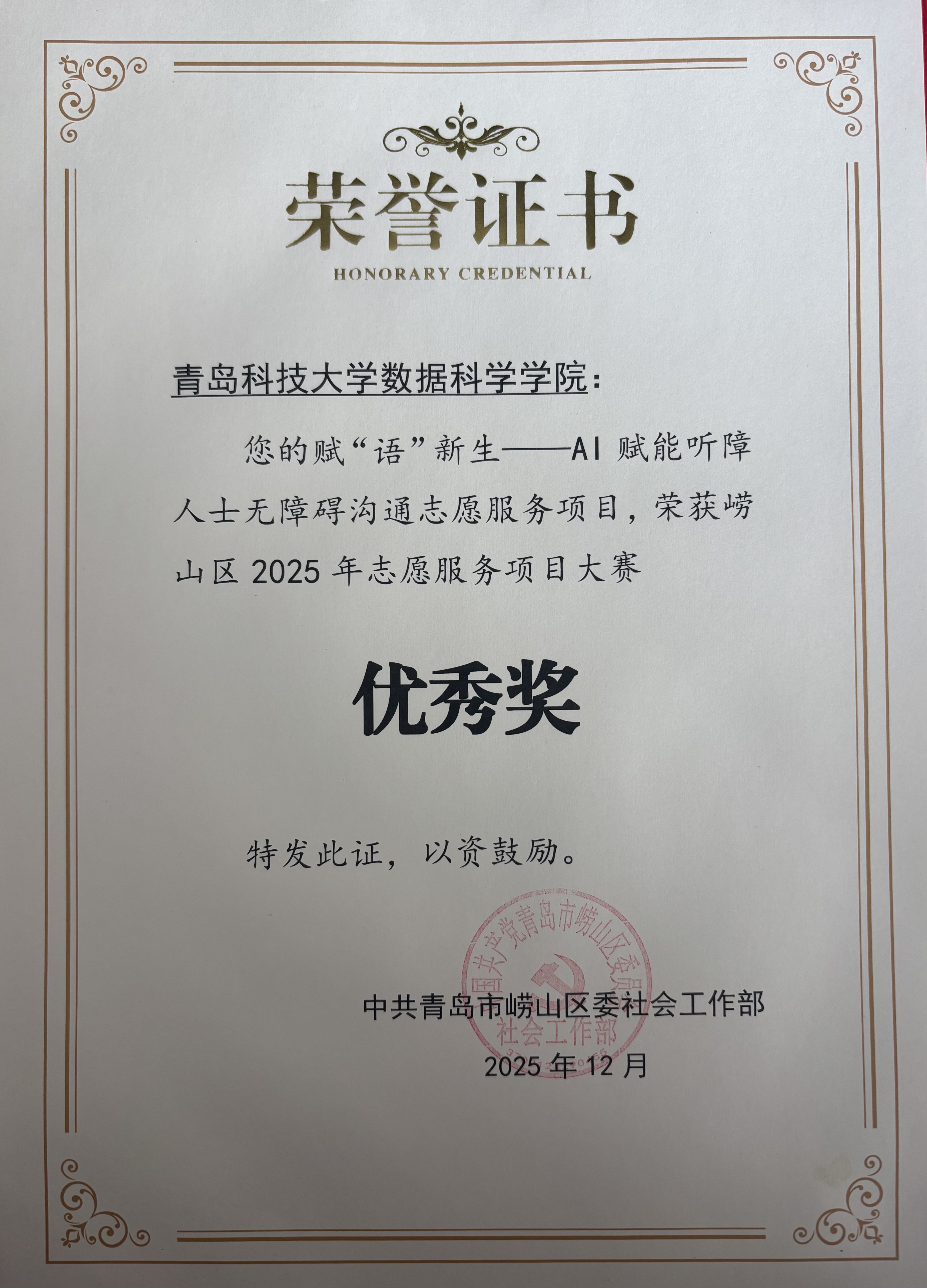 12月5日,在第40个“12·5”国际志愿者日系列活动期间,bevictor1946韦德官网“小星云”志愿服务队的“赋‘语’新生——AI赋能听障人士无障碍沟通志愿服务项目”在青岛市志愿服务项目大赛中荣获优秀奖,并受邀参与志愿服务主题交流活动,与各获奖代表及志愿服务组织共话志愿力量凝聚与服务创新。