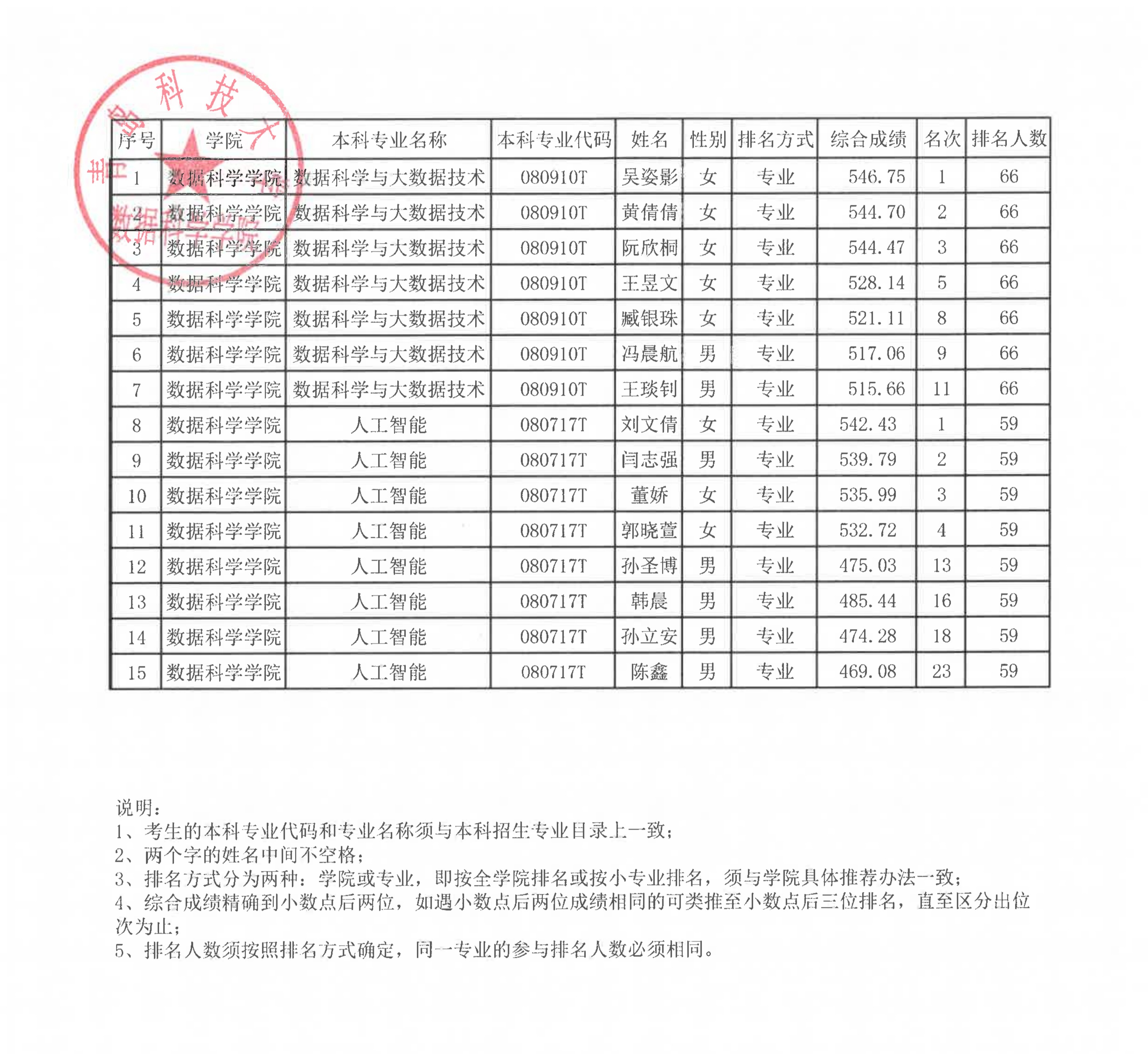 根据《2026年推荐优秀应届本科毕业生免试攻读硕士学位研究生工作方案》、《关于开展推荐优秀应届本科毕业生免试攻读硕士学位研究生工作的通知》和bevictor1946韦德官网《2026年推荐优秀应届本科毕业生免试攻读硕士学位研究生工作实施细则》等相关文件要求,现将2022级数据科学与大数据技术和人工智能专业各学期综合测评成绩排序及申请同学的四六级成绩、获奖情况进行公示,公示期:2025.9.10-2025.9.12,公示期内对公示情况有异议者,请及时反映,联系电话0532-88959389。