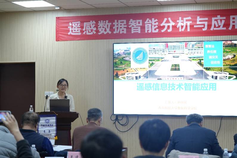 孙媛媛老师做了题为“遥感信息技术智能应用”的报告,介绍了团队基于遥感图像、视频、物联网数据等多模态数据,利用人工智能技术,开发设计的集城市管理监测、环境质量评估、自然资源监测、应急管理等功能于一体的“绿水青山一张图”服务平台,重点围绕青岛地区平台系统的建设规划及其中的关键技术研究展开介绍。该平台展示了遥感技术在不同领域的应用效果和发展前景,引发了与会者们的浓厚兴趣和广泛讨论。